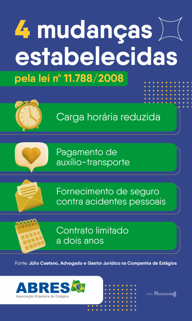 A primeira lei promulgada em 1977 era mais abrangente em relação aos direitos e deveres dos estagiários, empresas e entidades educacionais. Por isso, a norma em vigência veio para detalhar as responsabilidades de cada parte. “Muitos candidatos ingressavam em cargos distantes da área de formação e com atividades pouco relacionadas ao desenvolvimento profissional. A Lei 11.788/2008 surgiu para dar mais clareza e segurança”, complementa Júlio Caetano, Advogado e Gestor Jurídico na Companhia de Estágios.